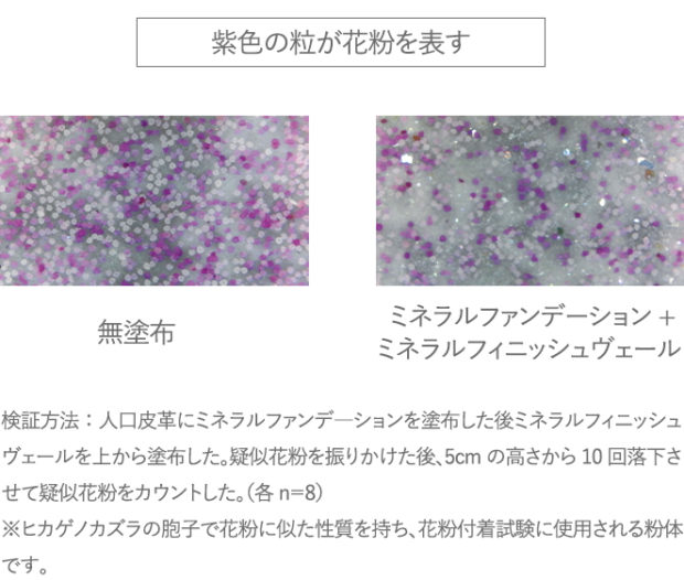 以下はビューティフルスキンのHPからの転載ですが、ビューティフルスキンのファンデーションに付着する花粉量は、リキッドファンデーションに付着する花粉量の1/2以下になることが分かります。