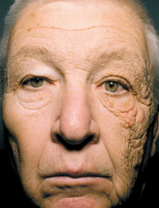 このお写真の方は69歳の男性で、28年間トラック運転手として働き(海外なので左ハンドル)左からずっと紫外線を浴びていました。その結果、左の顔の方が右に比べ「シミ・シワ・イボ」が、くっきりと沢山あります。これは、左の顔が紫外線によって「光老化した老化現象」となります。