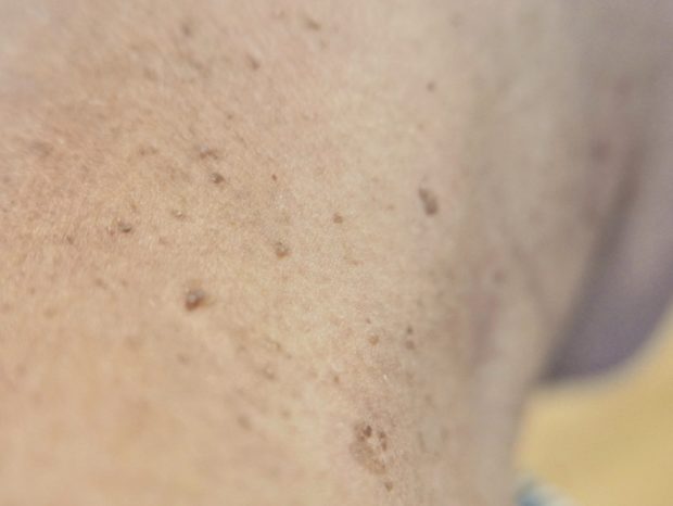 特にご高齢の方のお顔にできやすく、粘土を張り付けたようなイボや、首にブツブツとしたイボが特徴です。