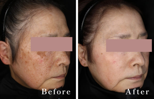セラピューティックプログラムは、ハイドロキノン・トレチノイン療法という、ハイドロキノンで皮膚を白くし、トレチノインで表皮のターンオーバを促進させます。また、シミを押し出しながらコラーゲンを生成し、シワを改善させ新しい皮膚に入れ替える治療となります。